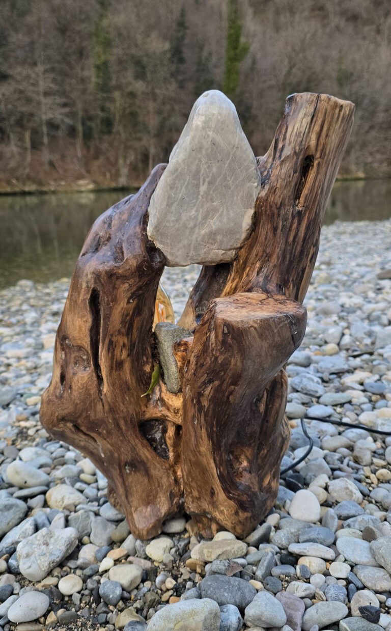 <h2>Ambientalna lučka "Dva kamna vmes"</h2> <strong>V:</strong> 46 cm<br> <strong>G:</strong> 36 cm<br> <strong>Š:</strong> 38 cm<br> <strong>Radiestezijska barva:</strong> Bela, 150°<br> <strong>Jakost energije:</strong> 500.000 Bovis / 100 %<br> <strong>Energijski spekter:</strong> Zemeljska energija<br> Lučka je bila najdena med Bovcem in Kobaridom v zgornji Soški dolini. Poleg sijalke sta v korenini dva vraščena kamna, ki delata izdelek še posebej zanimiv.<br> <a class="btn-send-inquiry" style="display: inline-block; padding: 10px 20px; background-color: #b9d6d4; color: #ffffff; text-align: center; t